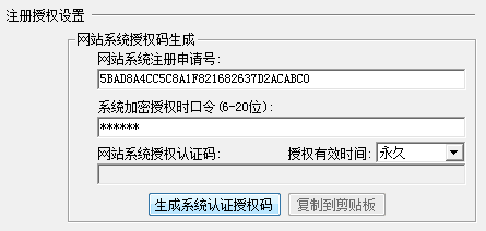 网站开发者根据用户提供的系统注册申请号和当初设的密码即可生成授权码。注意,如果设置了授权时间,那么客户在到达相应时间后系统会提示需要再次授权。